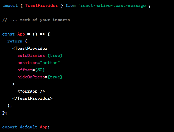 You must configure the 'ToastProvider' before you can use the toast messages. Add the following to your 'App.js' file by opening it: