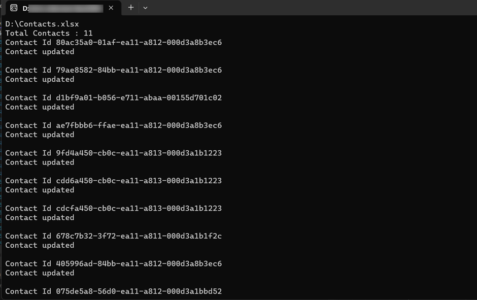 Step 5: Next is to build the solution, then after running the Command Prompt window will open it like this, here I have displayed the Contact ID and printed a message when a record gets updated.
