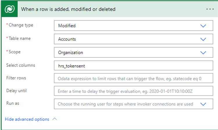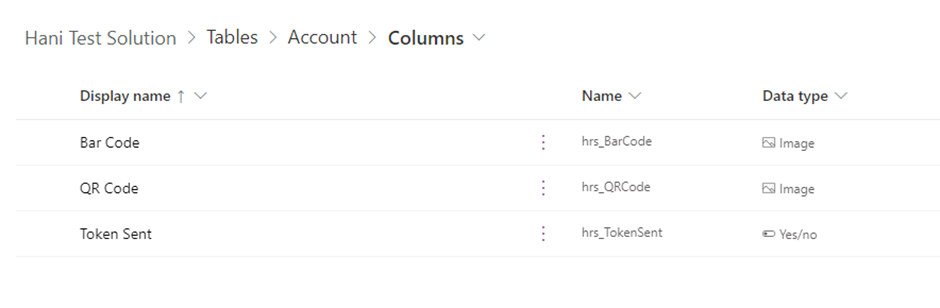 Here Account table is used in this demo. Below is the screenshot of columns added to the account table to store the bar code/QR code. the data type is an image. Additionally, added a Token Sent Yes/No type of field to trigger the Power Automate.