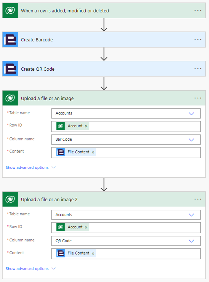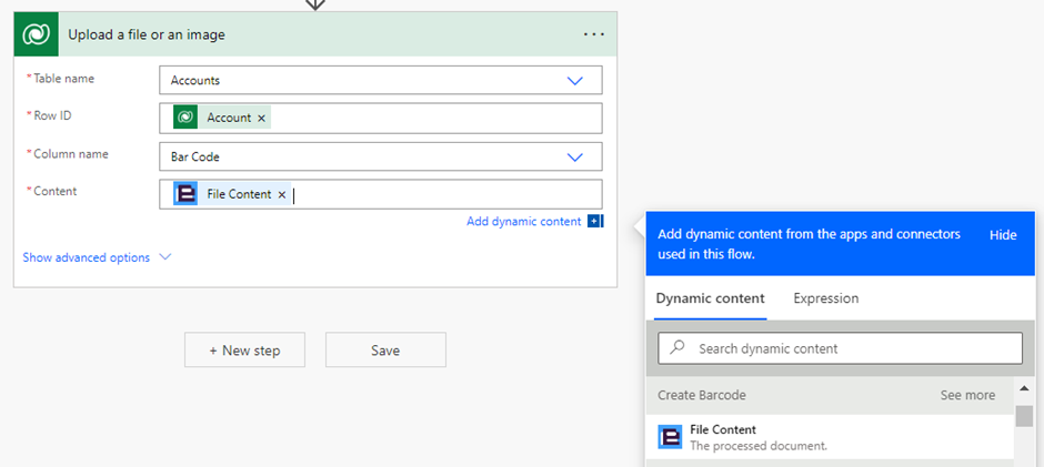 Add a new step to store the Barcode and QR code in the Dataverse record. add connector Dataverse and add an action named “upload a file or an image”. In Table Choose Accounts, Row ID is chosen as the account record ID from the dynamic panel from the trigger step. Column name select the Barcode column to store the Barcode image. In content, select the File content option from the Create Barcode step.