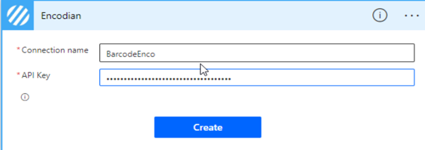 Add 1st the Barcode action step and then the QR Code action step. Provide the name of the connection of your choice and provide the API key generated in the previous step.