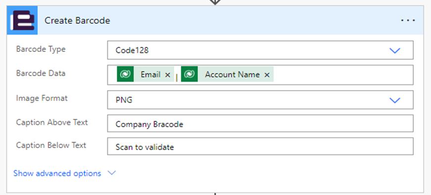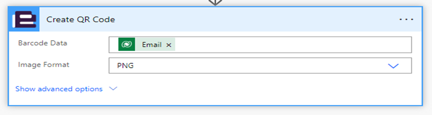 Next, add the QR generate action and follow the same procedure to supply values. Provide Barcode data and Image format.